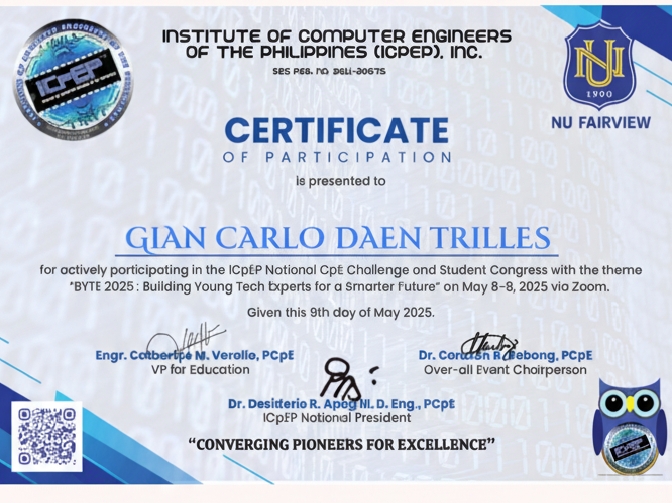 Pursuing a BSCpE degree with coursework covering embedded systems, computer networks, digital electronics, signal processing, software engineering, and database management. Actively participating in webinars, national congresses, and DICT training programs to supplement academic learning.